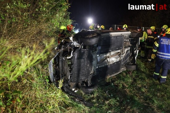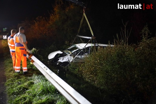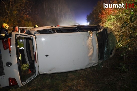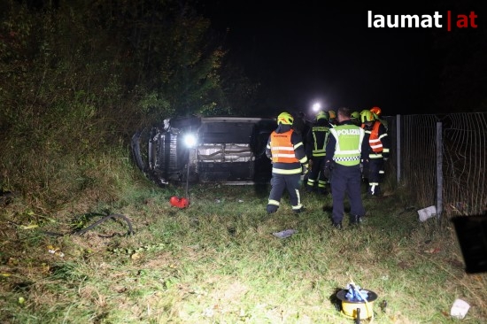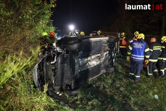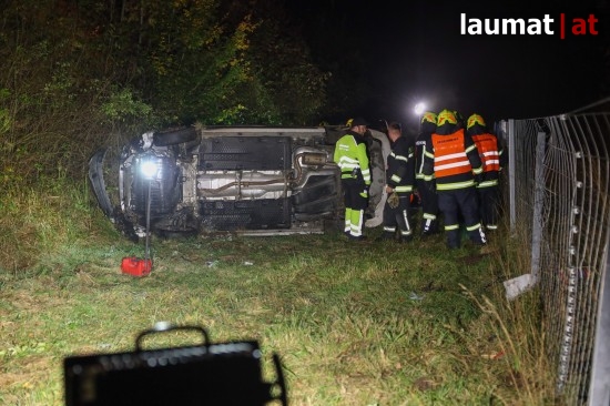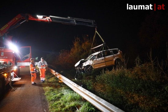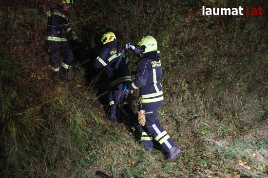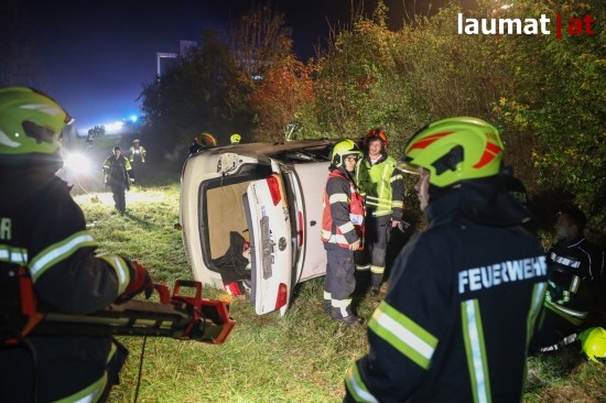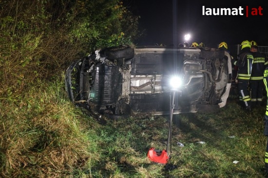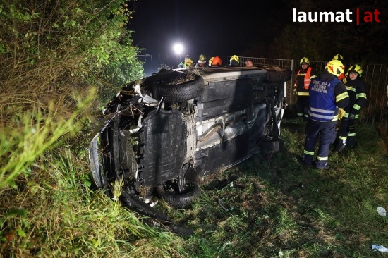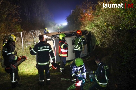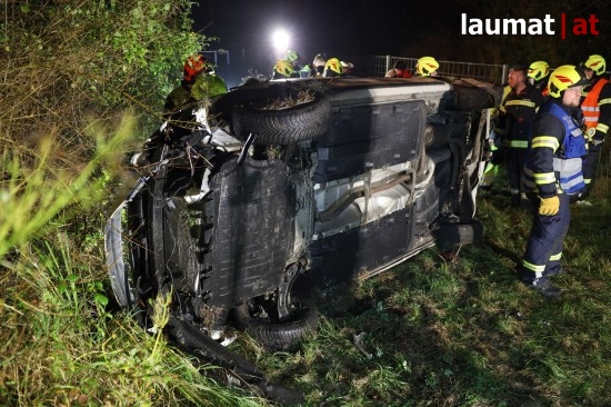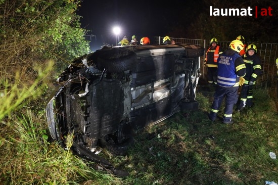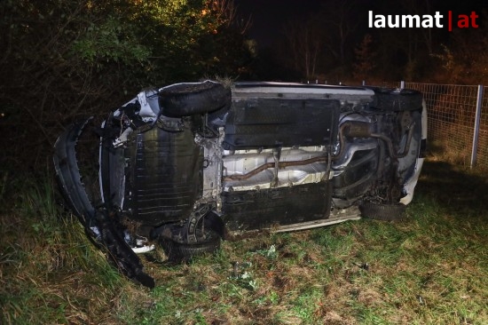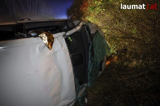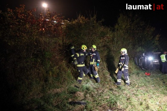 Ein Auto ist ersten Angaben nach von der Fahrbahn der A25 Welser Autobahn im Gemeindegebiet von Weißkirchen an der Traun abgekommen und über eine längere Wegstrecke neben und unterhalb der Autobahn weitergefahren, gegen Bäume gekracht und hat sich dabei überschlagen. Das Auto kam in Seitenlage zum Stillstand. Die Unfallstelle war nur äußerst schwer einzusehen. Nach längerer Suche konnten die Einsatzkräfte den verunfallten Wagen entdecken. Zwei Insassen mussten von den Kräften der Feuerwehr aus dem Unfallwrack befreit werden.