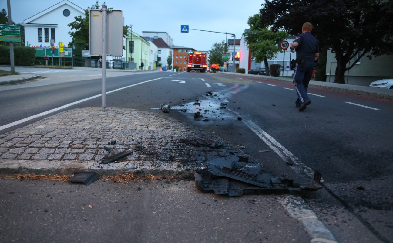 Auto kollidierte in Thalheim bei Wels mit Verkehrsinsel und verursachte lange Ölspur