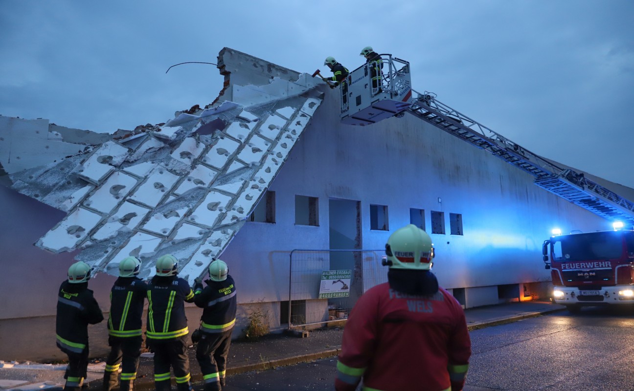 Teile der Fassade drohten nach begonnenem Abbruch eines Stadions in Wels-Lichtenegg abzustürzen