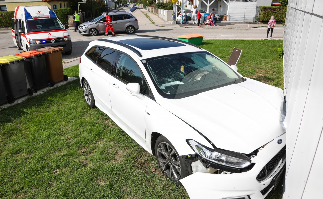 Auto kracht nach Kreuzungscrash in Wels-Neustadt gegen Hausmauer