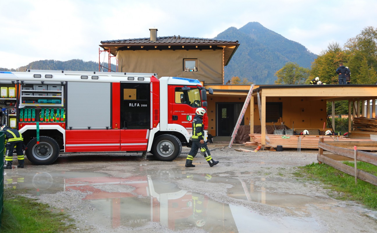 Feuerwehr bei Brand auf Baustelle in Grünau im Almtal im Einsatz