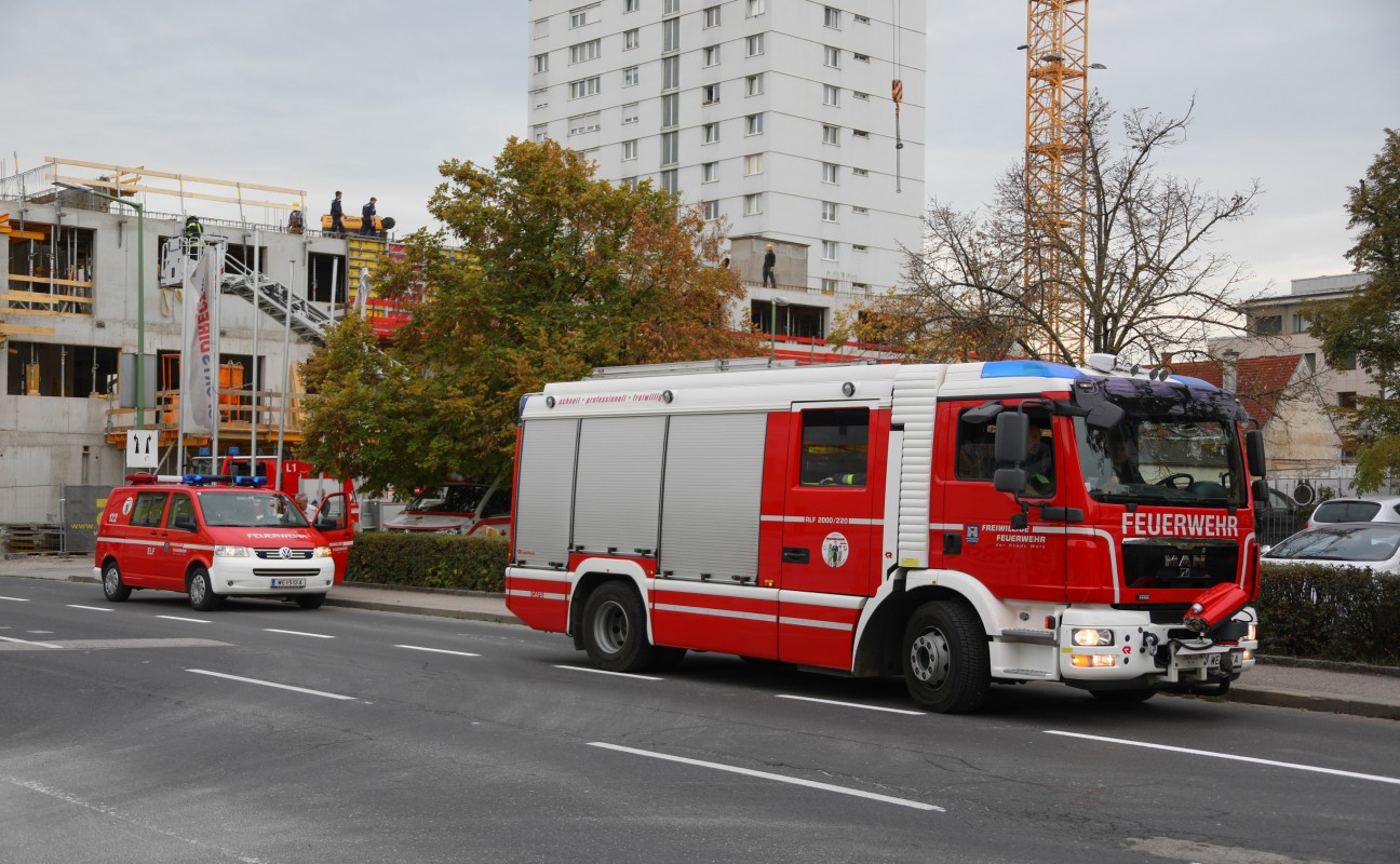 Verletzter Arbeiter auf Baustelle in Wels-Innenstadt mittels Drehleiter gerettet