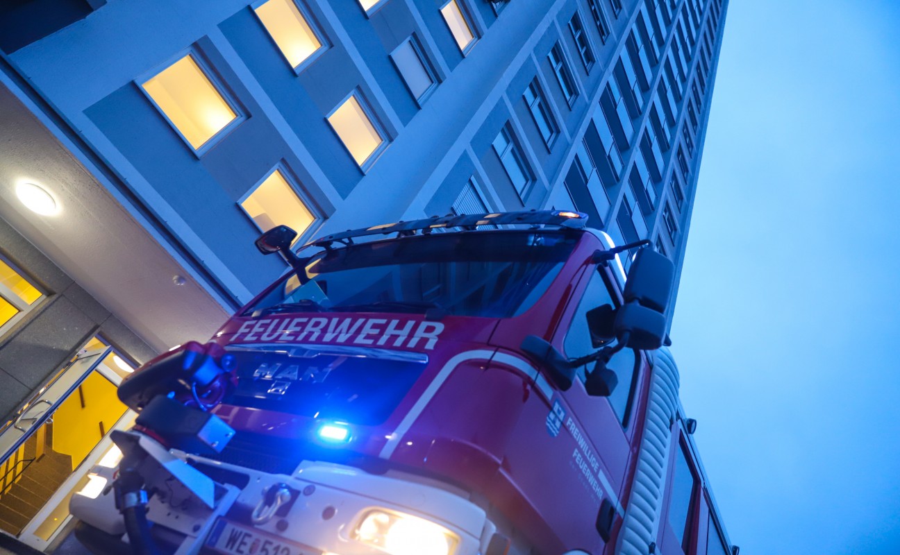 Feuerwehr bei Brand eines Türkranzes im Maria-Theresia-Hochhaus in Wels-Innenstadt im Einsatz