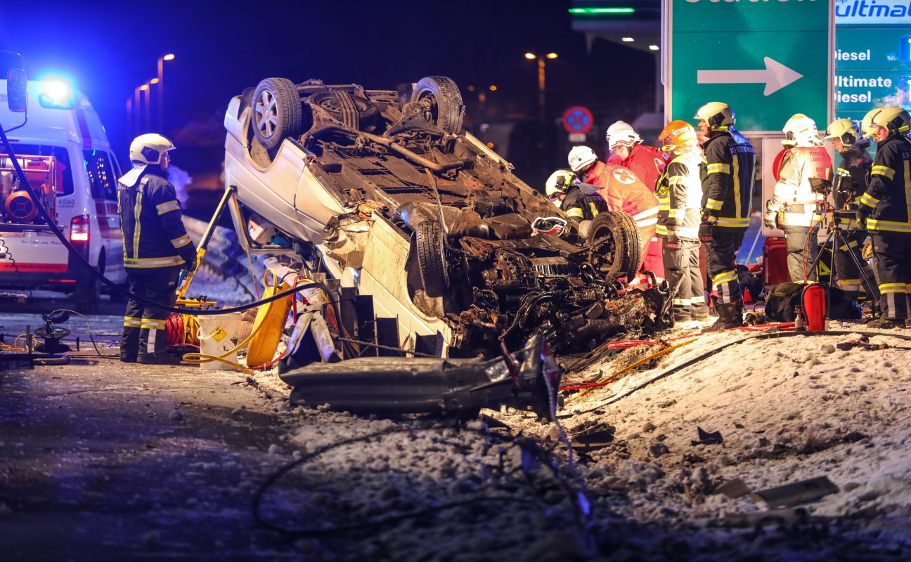 Schwerer Verkehrsunfall mit zwei eingeklemmten Insassen auf Westautobahn bei Laakirchen