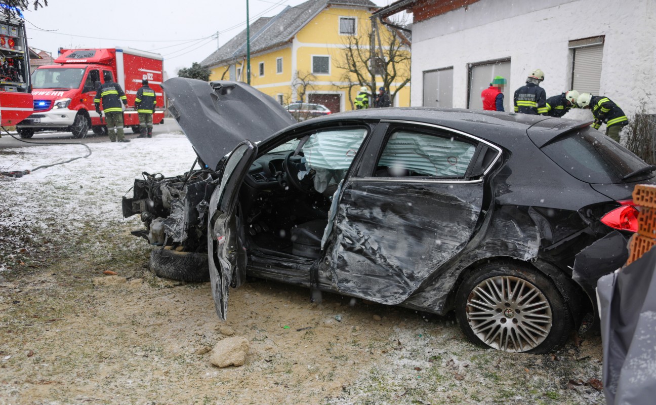 Auto bei Verkehrsunfall in Hartkirchen gegen Baum und Garage gekracht und in Garten gelandet