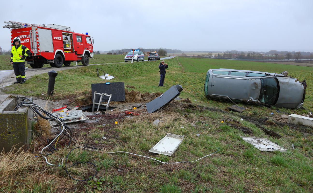 Auto kollidierte bei Buchkirchen frontal mit Pumpstation und überschlug sich in ein Feld