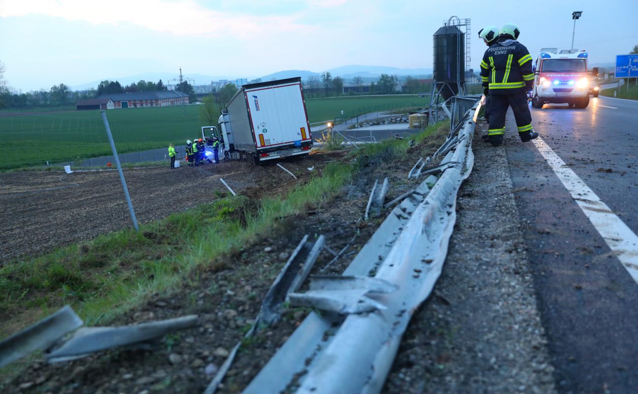 Sattelzug nach Unfall auf Steyrer Straße in Enns beinahe abgestürzt