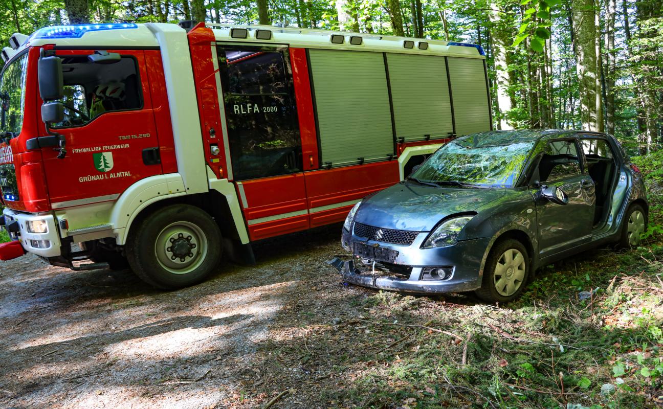 Auto auf Bergstraße in Grünau im Almtal überschlagen - Menschenrettung nach Verkehrsunfall