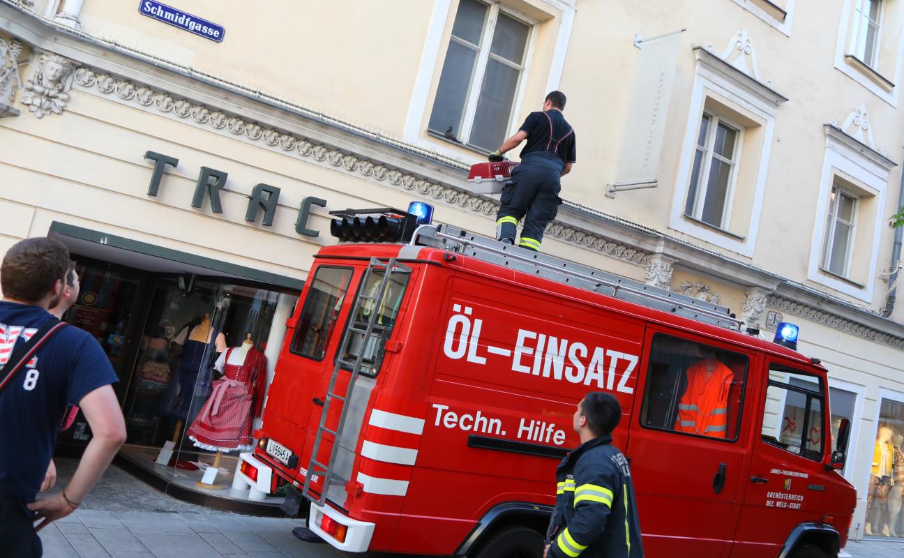 Geschwächte Taube in Wels-Innenstadt durch Feuerwehr und Tierhelferinnen gerettet