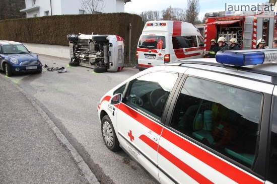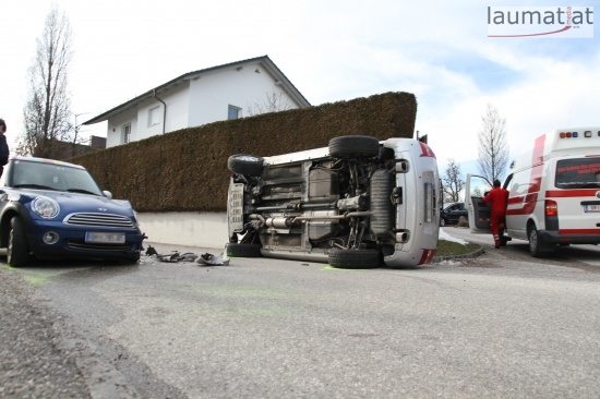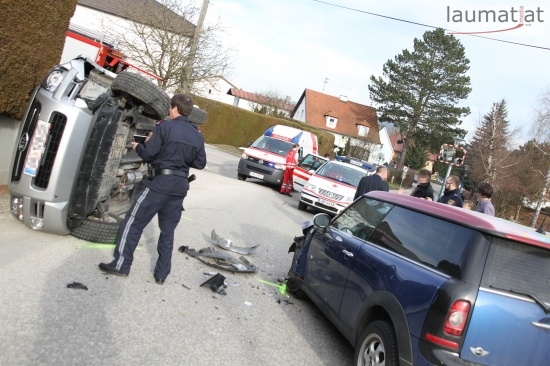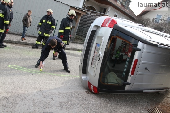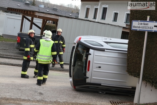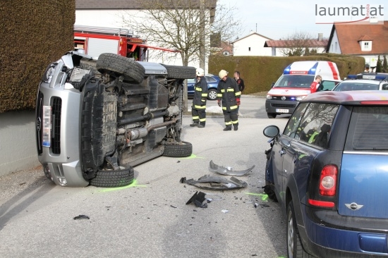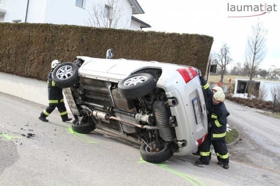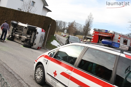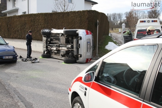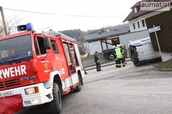 Fahrzeug bei Verkehrsunfall in Wallern an der Trattnach umgekippt