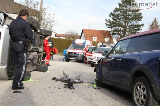 Wallern an der Trattnach. Glücklicherweise glimpflich endete für die Insassen zweier PKWs ein spektakulärer Verkehrsunfall im Ortsgebiet von Wallern an der Trattnach.