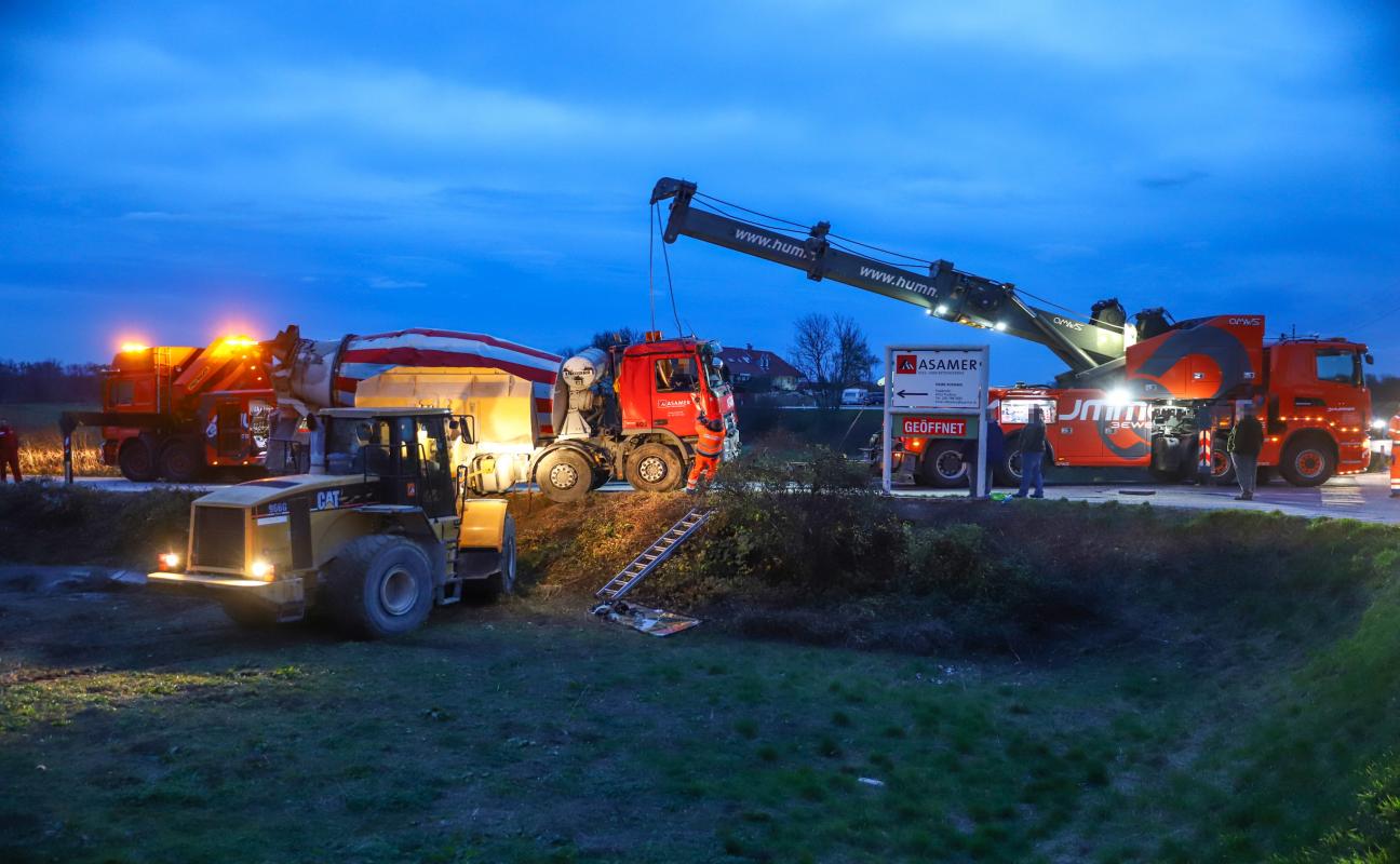 Betonmischwagen bei Pucking über Straßenböschung gestürzt