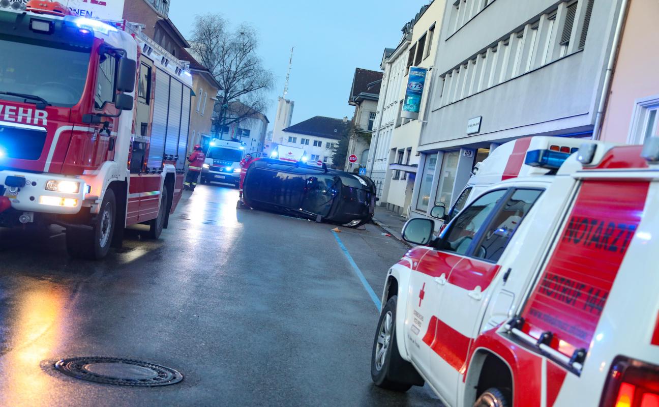 Menschenrettung: Auto bei Verkehrsunfall in Wels-Innenstadt auf die Seite gekippt