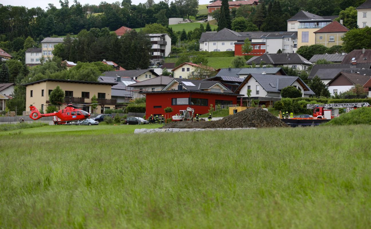 Notarzthubschrauber bei Personenrettung auf Baustelle in Schlierbach im Einsatz