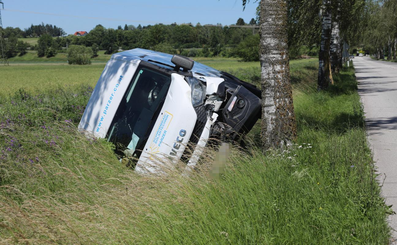 Kleintransporter bei Verkehrsunfall in Wels-Puchberg umgestürzt