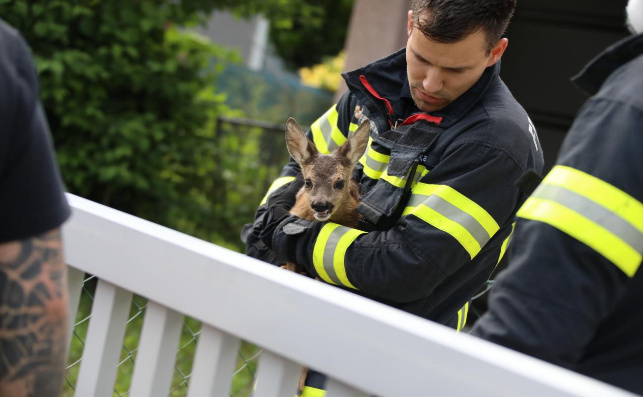 Rehkitz im Garten eines Hauses in Wels-Pernau von Einsatzkräften der Feuerwehr eingefangen