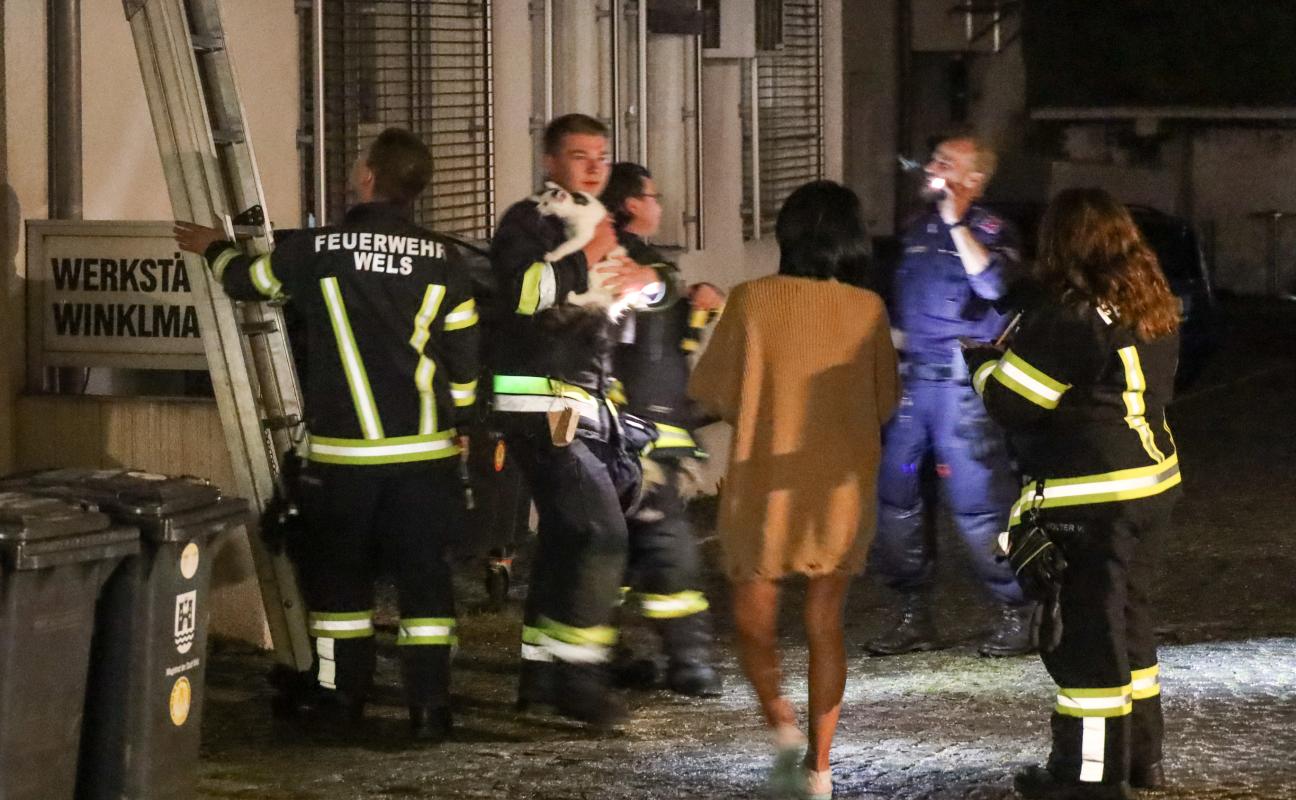 Katze durch Einsatzkräfte der Feuerwehr und Polizei in Wels-Innenstadt von Vordach gerettet