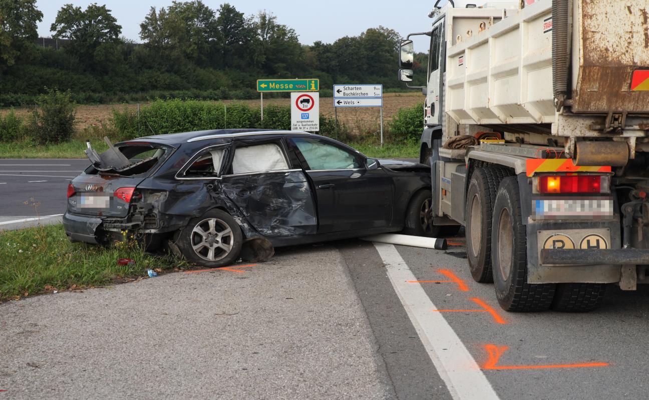 Eine Schwer- und vier Leichtverletzte bei Kollision zwischen Reisebus, PKW und LKW in Wels-Puchberg