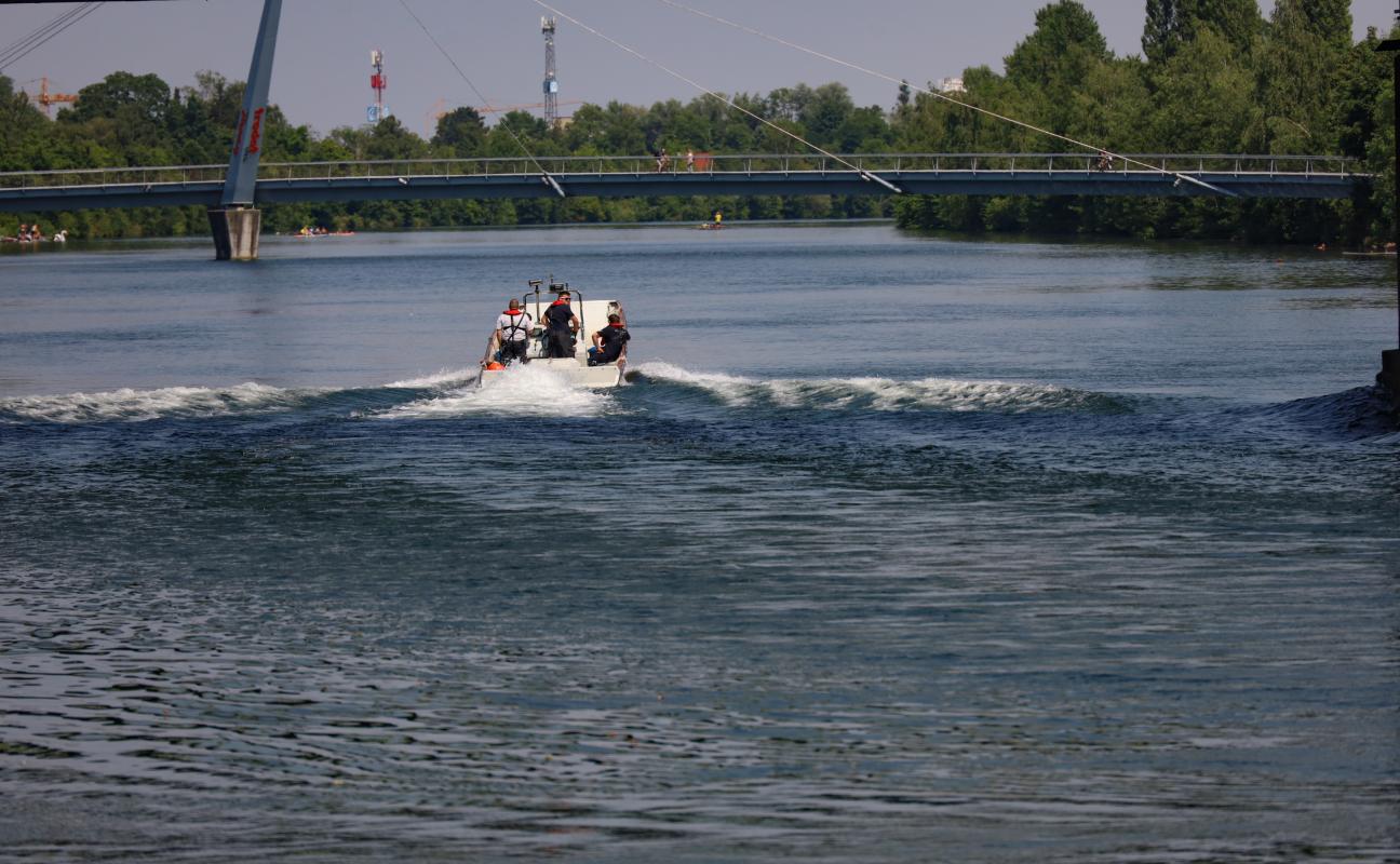 Boot der Feuerwehr bei Suche nach einem vermissten Hund in der Traun im Einsatz