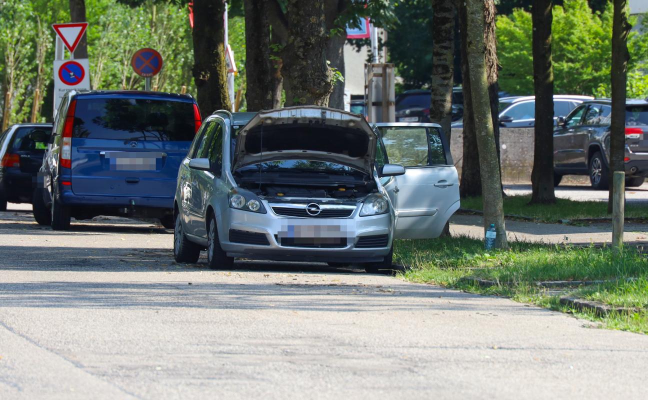 Feuerwehr bei bereits gelöschtem Kabelbrand an einem PKW in Wels-Innenstadt im Einsatz