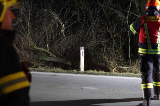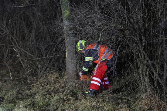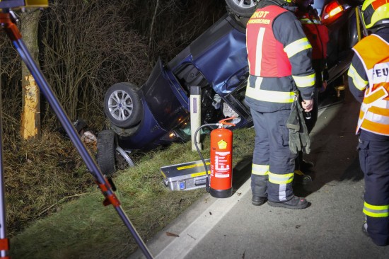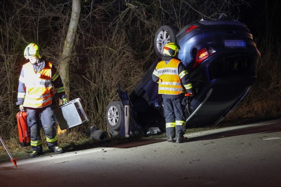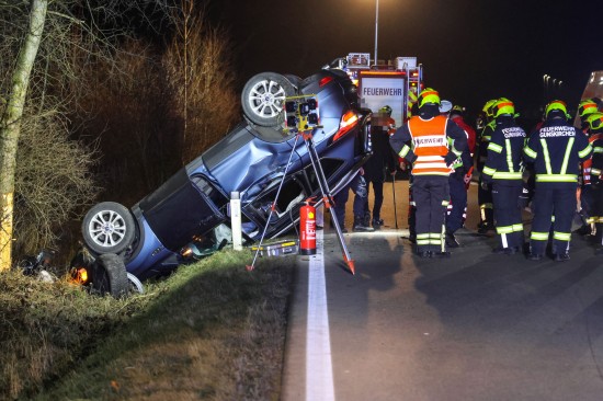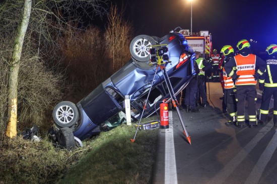 Die Einsatzkräfte zweier Feuerwehren wurden zur Personenrettung nach einem Verkehrsunfall auf die B1 Wiener Straße bei Gunskirchen alarmiert. Ein Auto ist dort offensichtlich links von der Straße abgekommen, nach einer Fahrt entlang der Böschung gegen einen Baum geprallt und hat sich dann überschlagen. Das Unfallfahrzeug kam dann am Dach liegend zum Stillstand. Beim Eintreffen der Feuerwehr war bereits niemand mehr im Fahrzeug. Eine Person wurde leicht verletzt und nach der Erstversorgung durch Rettungsdienst und Notarzt ins Klinikum Wels eingeliefert. Die Feuerwehr unterstützte in weiterer Folge das verständigte Abschleppunternehmen bei der Bergung des Unfallwagens. Danach musste noch ein Baum, der beim Anprall schwer beschädigt wurde, gefällt werden.