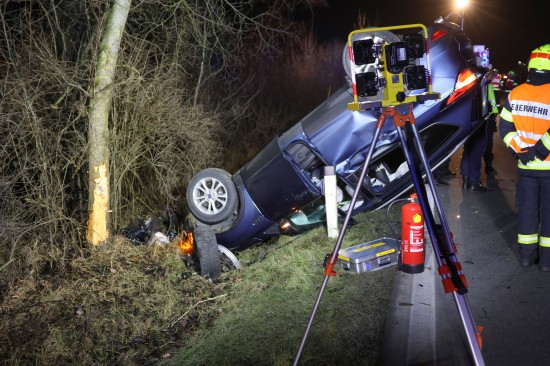 Auto gegen Baum: PKW landete nach schwerem Verkehrsunfall auf Wiener Straße bei Gunskirchen am Dach