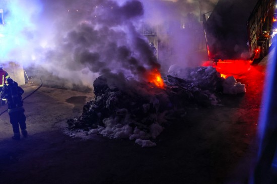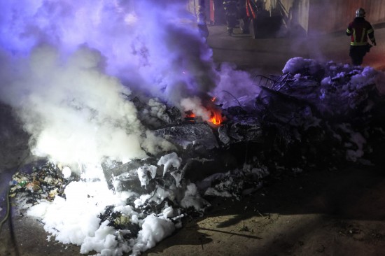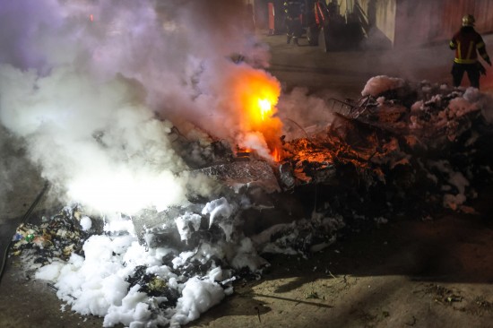 "Ein Notrufteilnehmer meldete am späten Mittwochabend einen Feuerschein bei einem Abfallcontainer in Wels-Neustadt. Beim Eintreffen der Feuerwehr bestätigte sich die Meldung, ein Container gefüllt mit Sperrmüll stand in Vollbrand. Umgehend wurde durch einen Atemschutztrupp ein Löschangriff gestartet. Der Brand konnte dann schnell unter Kontrolle gebracht werden. Ein Übergreifen der Flammen auf die umliegende Bebauung konnte durch die Feuerwehr erfolgreich verhindert werden. Im Anschluss wurde der betroffene Container bis oben hin mit Schaum geflutet, um das Feuer endgültig zu ersticken. Die Einsatzkräfte wurden um ca. 05:00 Uhr in der Früh nochmals zu derselben Einsatzadresse alarmiert. Das betroffene Objekt hatte wieder zu brennen begonnen. Das Feuer konnte abermals schnell gelöscht werden. Das Brandgut wurde dann aus dem betroffenen Container herausgenommen, auf einer Freifläche verteilt und dort endgültig abgelöscht. Die Einsatzstelle konnte abschließend der Polizei übergeben werden."