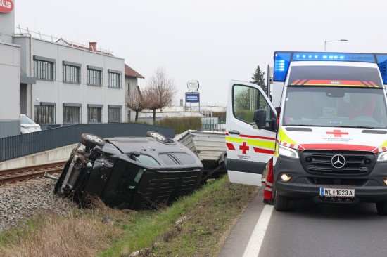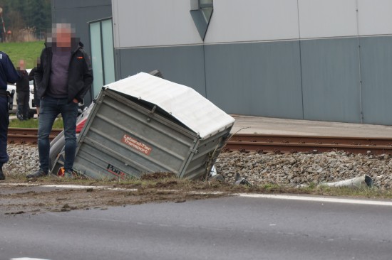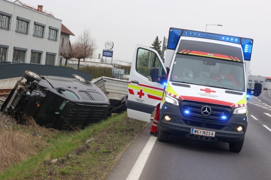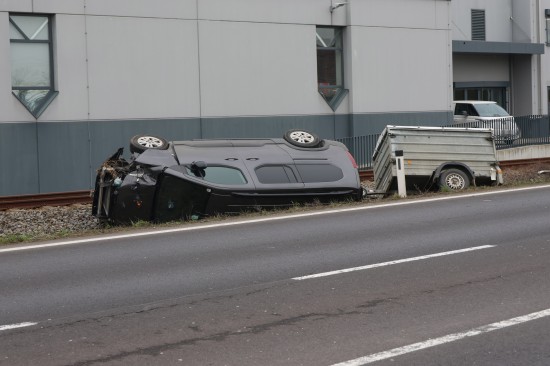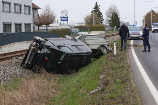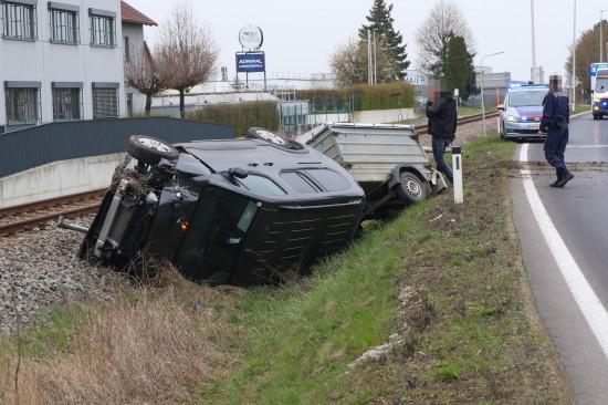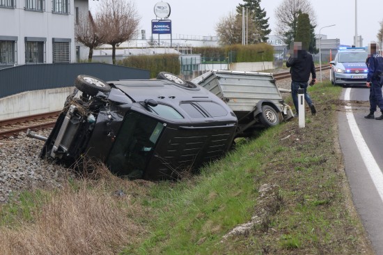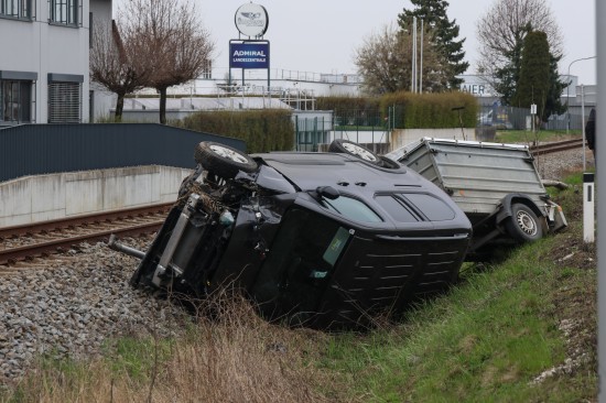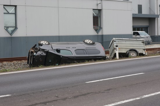 Ein PKW samt Anhänger kam auf der B138 Pyhrnpass Straße, Reitingerstraße, im Gemeindegebiet von Steinhaus aus noch unbekannten Gründen von der Straße ab. Der PKW rammte eine Straßenlaterne, überschlug sich dabei und kam auf dem Dach liegend im Bereich des Bahndamms der Almtalbahn zum Stillstand, der Anhänger auf den Rädern dahinter. Weitere Verkehrsteilnehmer und ein Nachbar eilten zur Hilfe. Der unmittelbar danach herannahende Triebwagen der Almtalbahn konnte noch vor der Unfallstelle anhalten. Der Autolenker konnte zwischenzeitlich das Auto eigenständig verlassen. Der Regionalzug konnte die Einsatzstelle dann passieren. Der Autolenker wurde vom Rettungsdienst versorgt.
