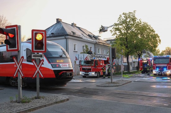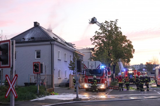 Fünf Feuerwehren, Rettung, Polizei und ÖBB standen Samstagfrüh bei einem Brand des Dachstuhls bei einem Doppelhaus in Wels-Innenstadt im Einsatz.